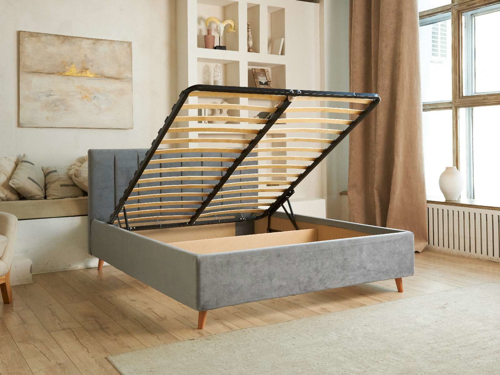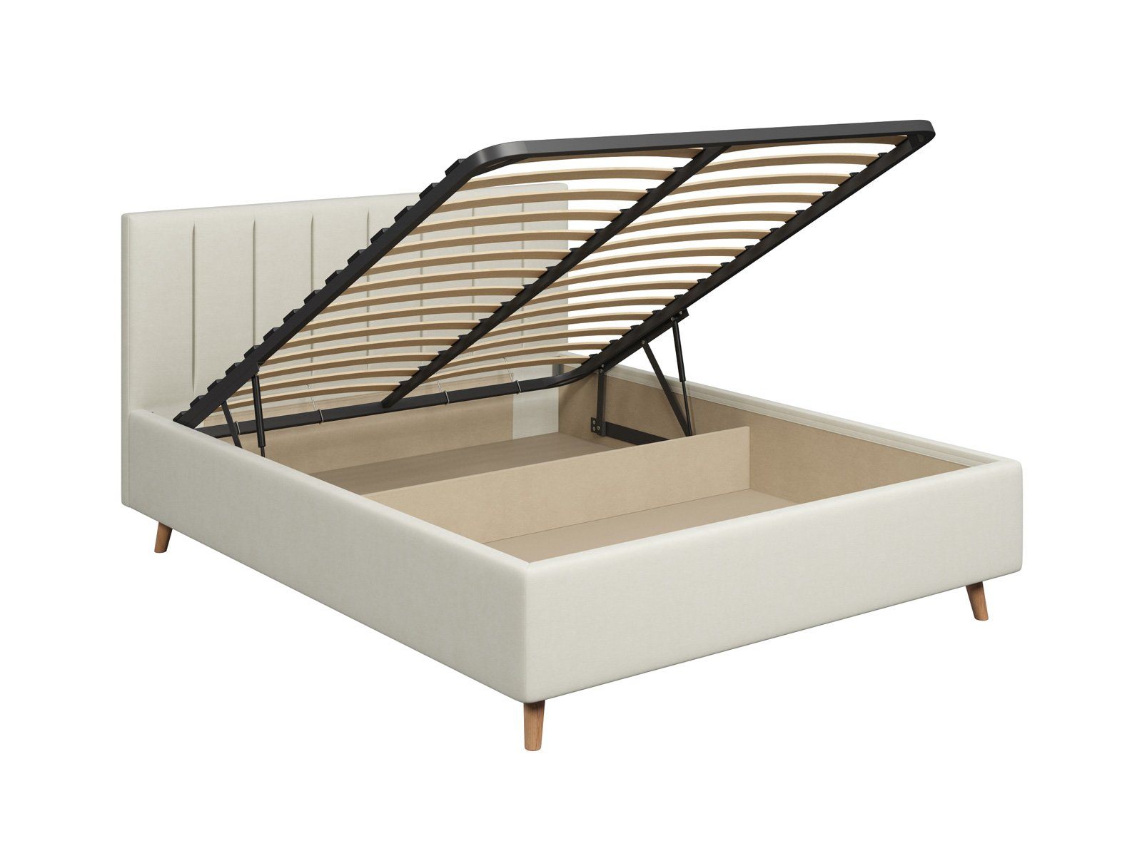 В комплектации с подъемным механизмом кровать имеет вместительный бельевой короб с двумя отделениями.