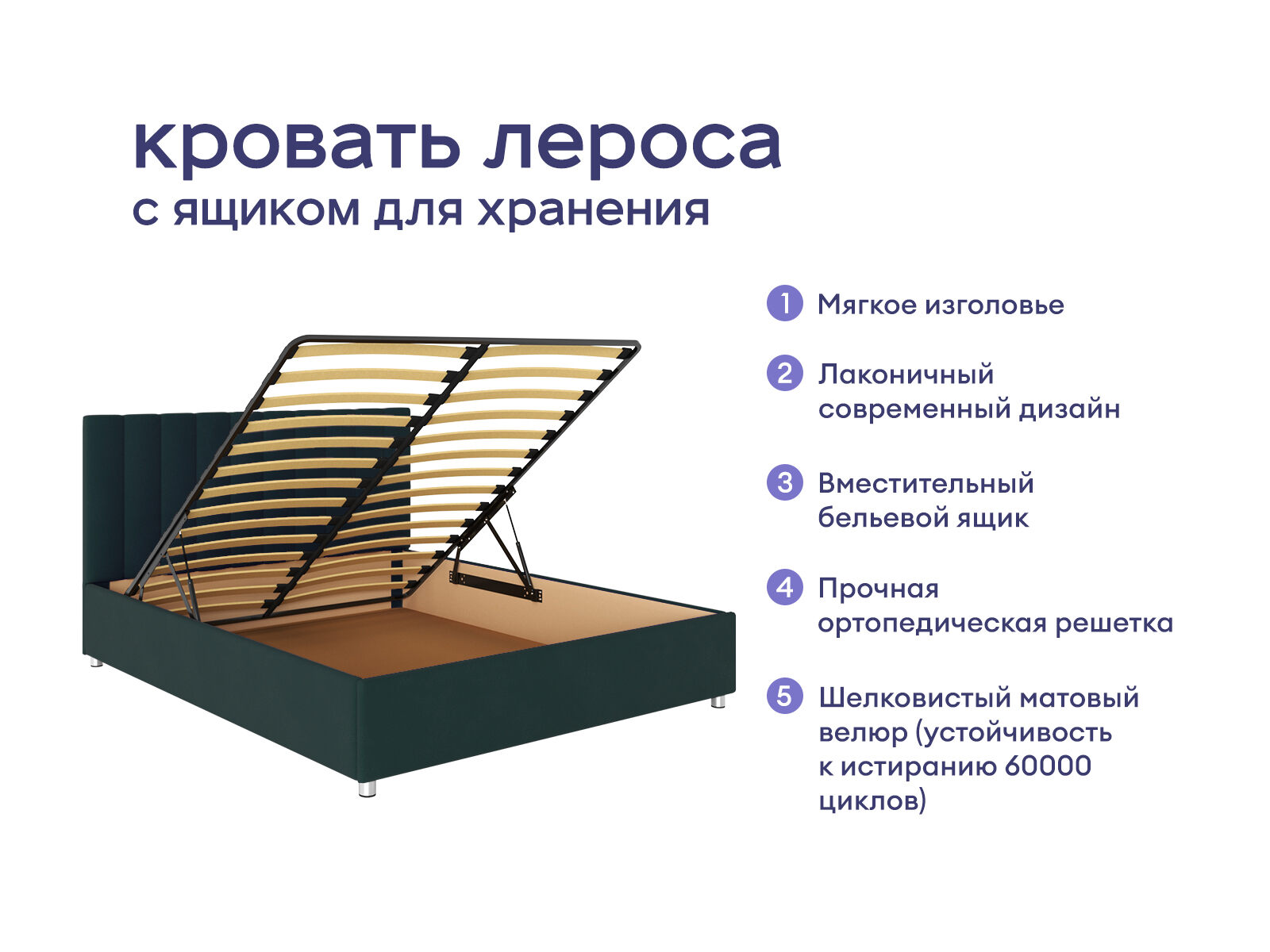 Модель отличается лаконичным изголовьем, которое украшает вертикальная параллельная стёжка. Стильная модель выделяется продуманным дизайном и украсит любой интерьер. Обивка кровати изготовлена из мягкого велюра. Короб производится из ДСП. В комплект входит ортопедическое металлическое разборное основание с подъемным механизмом.