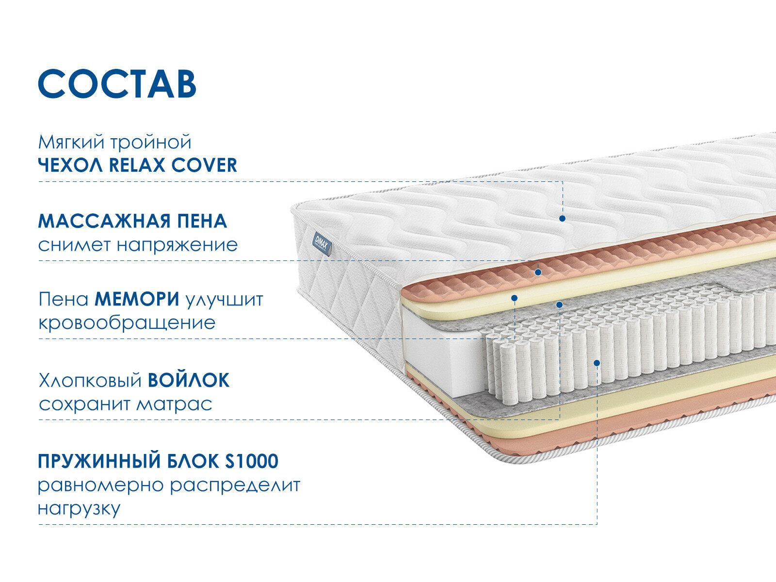 Массажный матрас Димакс Relmas Memory S1000 – это сочетание инновационных технологий и исключительного комфорта. Благодаря свойству памяти формы, модель идеально подойдёт для тех, кто ищет максимально комфортное спальное место с идеальной адаптацией под линии тела.
