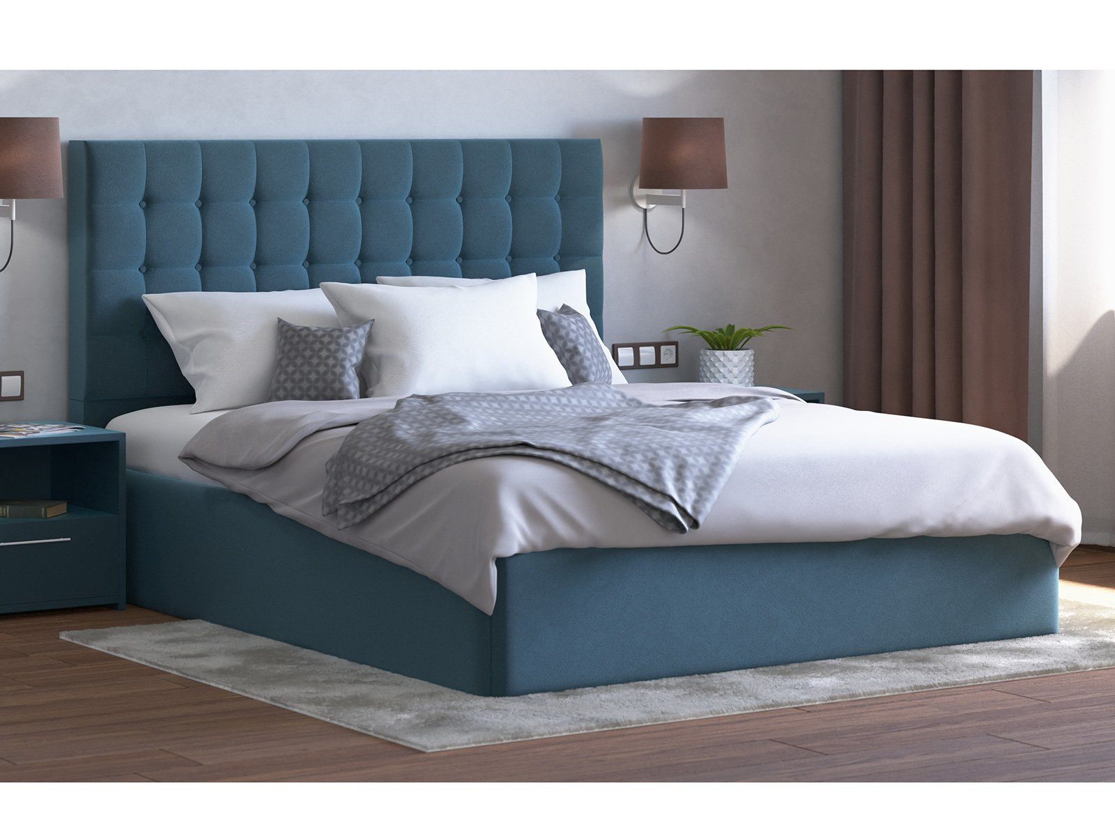 Мягкая кровать с обивкой из велюра.