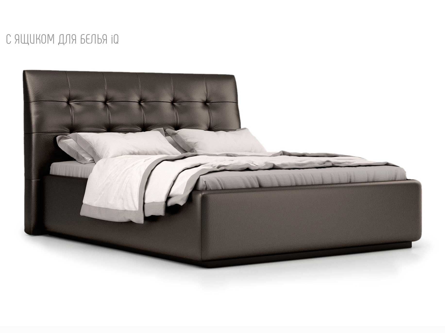 Кровать укомплектована IQ с подъемным механизмом и ящиком для белья без дна (дополнительная платная опция - дно к ящику IQ из HDF (ХДФ). Каркас кровати на цоколе, декоративный чехол на цоколе съёмный. Глубина ящика для белья - 30 см, без ограничения нагрузки на ящик.