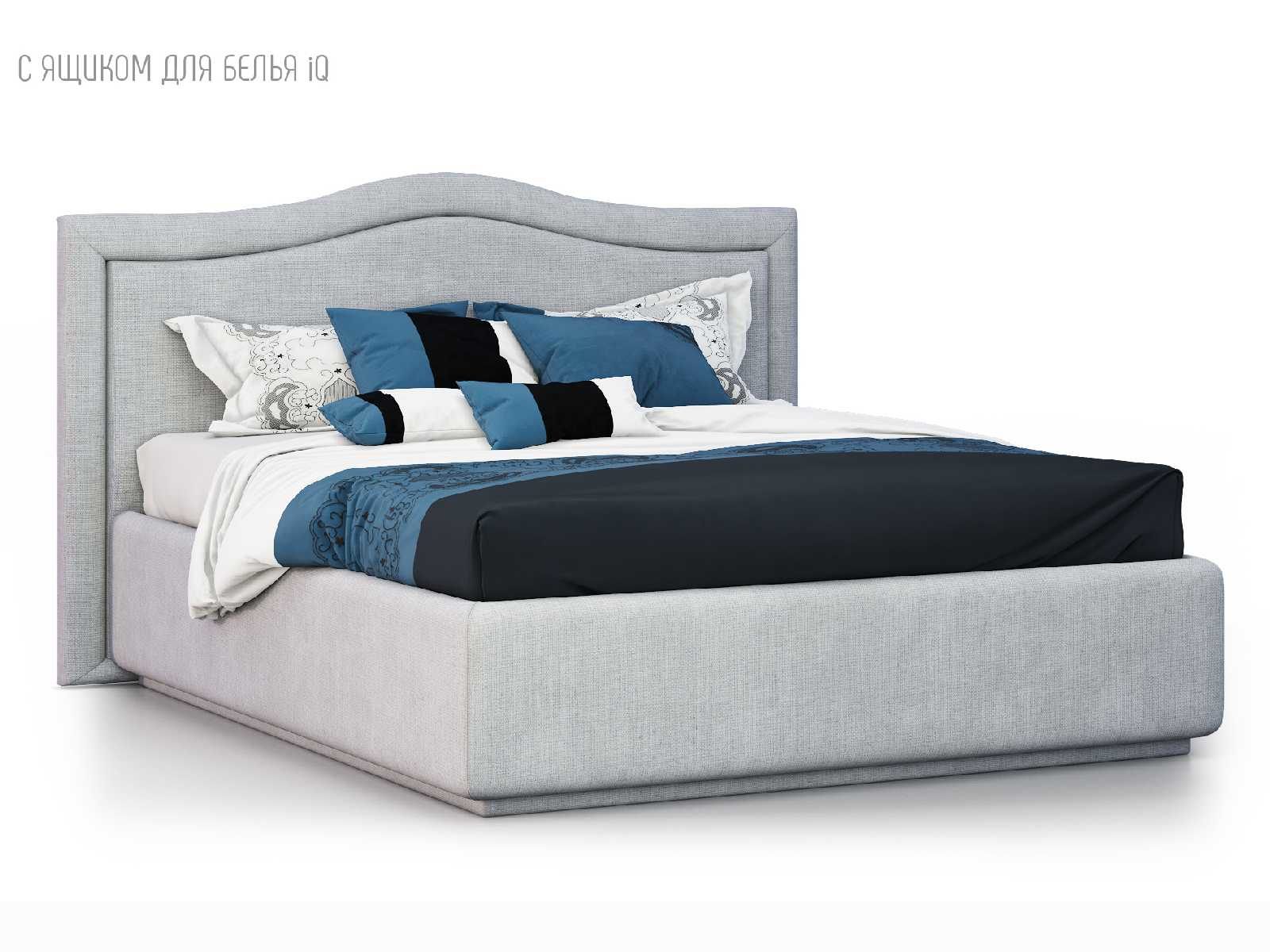 Кровать укомплектована IQ с подъемным механизмом и ящиком для белья без дна (дополнительная платная опция - дно к ящику IQ из HDF (ХДФ). Каркас кровати на цоколе, декоративный чехол на цоколе съёмный. Глубина ящика для белья - 30 см, без ограничения нагрузки на ящик.