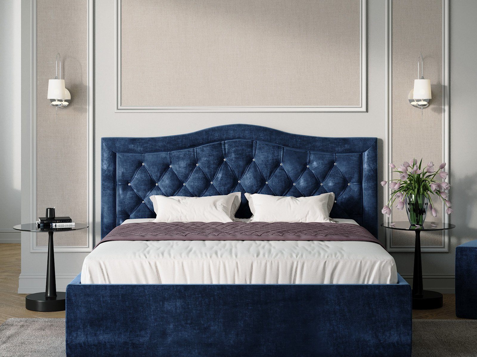 Шикарная и стильная кровать Vicensa с фигурным изголовьем, украшенным каретной стяжкой, способна стать центральным элементом вашей спальни. По желанию покупателя изголовье кровати может быть украшено декоративными пуговицами или стразами (дополнительная платная опция).