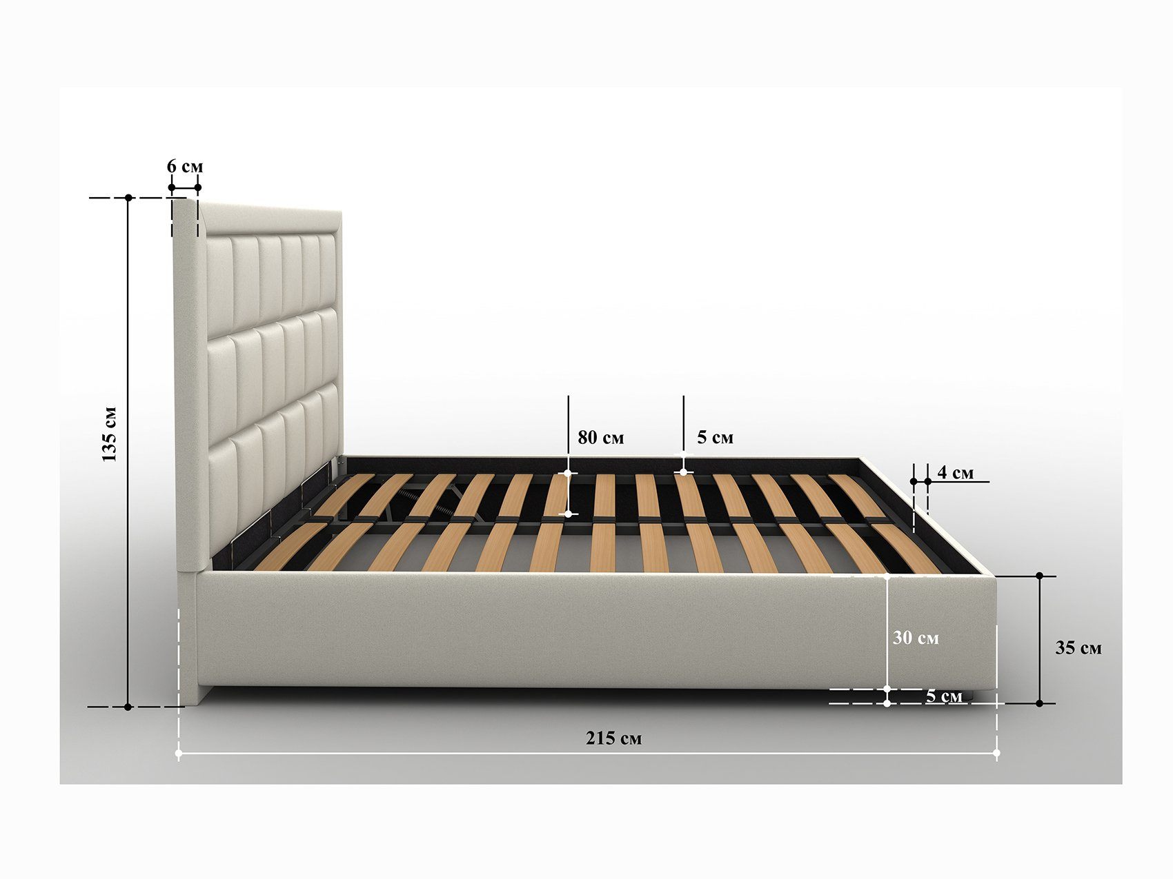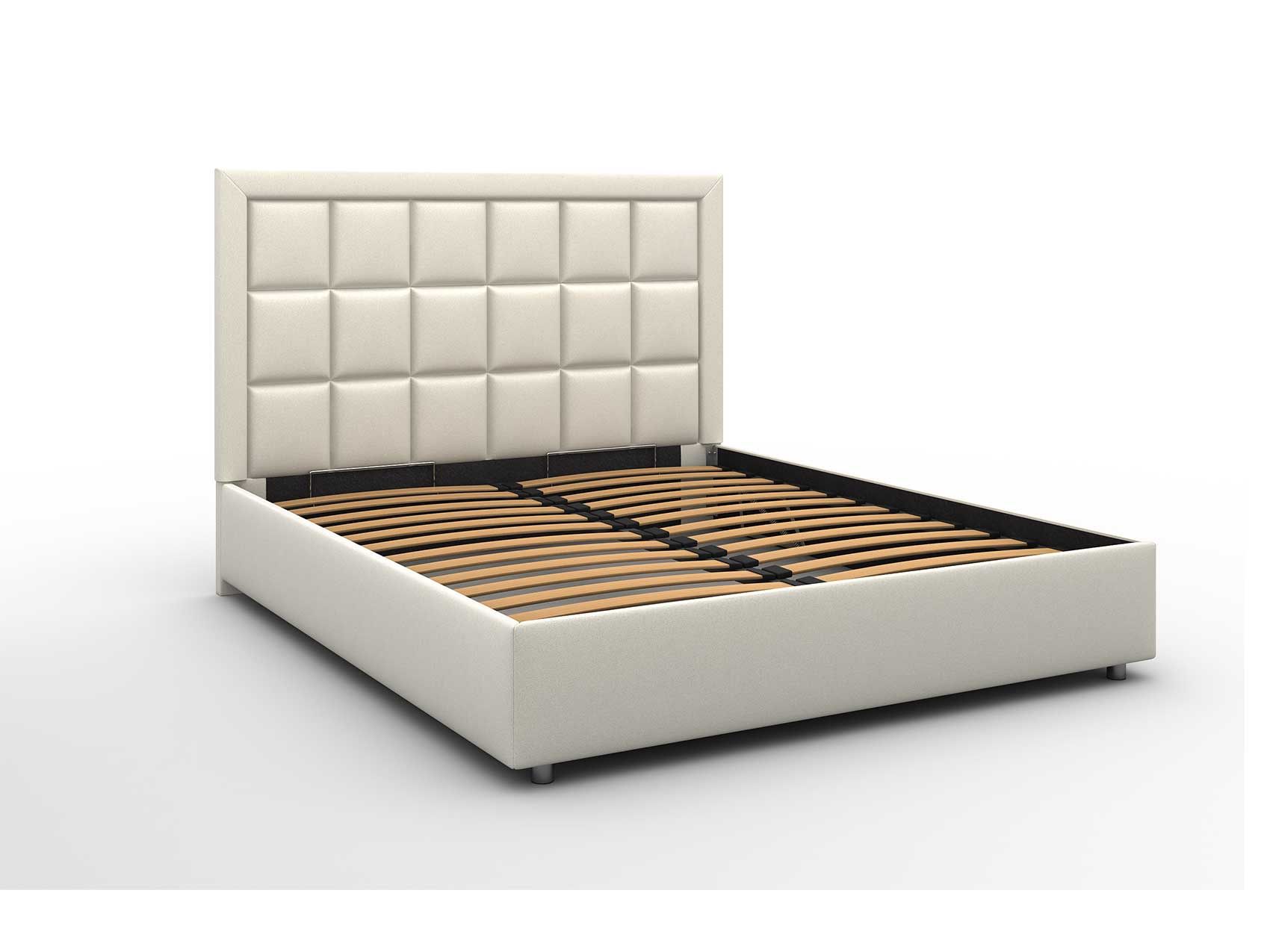 Кровать поставляется в комплекте с металлическим основанием, которое располагает деревянными ламелями. Рейки удерживают матрас и работают мягко и согласованно. Система заточена на органичное распределение поступающей нагрузки и выдерживает до 250 кг.