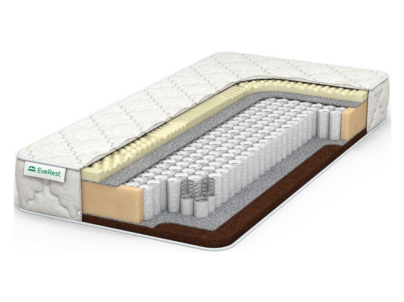 Пружинный матрас EveRest Кокос латекс 7 зон ТФК характеризуется контрастным наполнением сторон. Каждая поверхность обладает своими особенностями и что важнее – уровнем жёсткости. Модель показывает высокую твёрдость и выраженную мягкость в зависимости от того, какой стороной установлена.