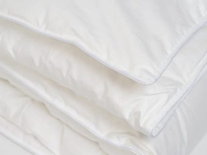 Всесезонное одеяло Воздушный Вальс с 100% пуховым наполнителем в снежно-белом чехле с атласным белым кантом. Ткань чехла - 100% хлопок – батист с антибактериальной обработкой "ACTIGARD".