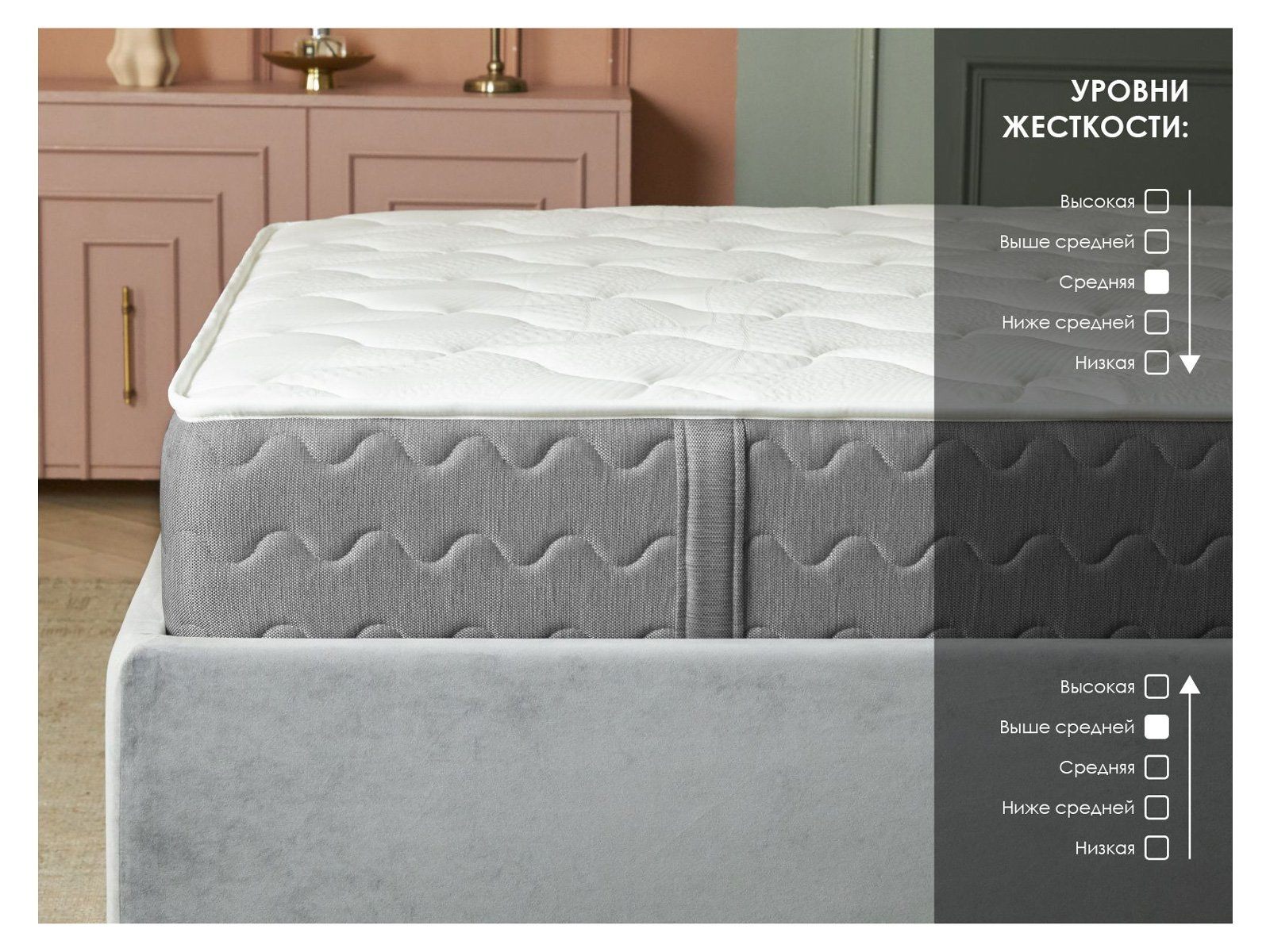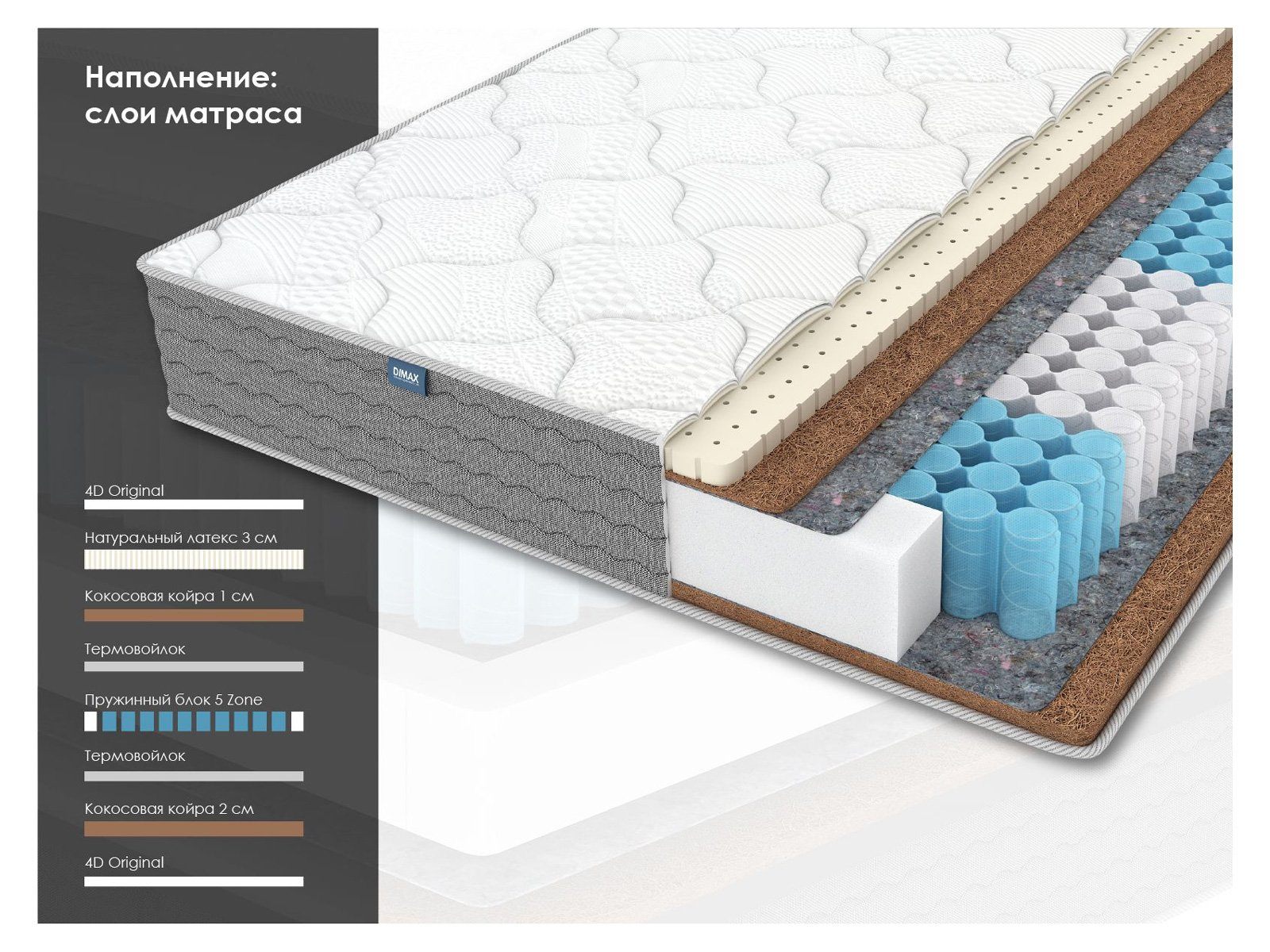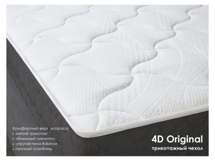 Модель сочетает надёжный 5-зональный пружинный блок, двусторонние наполнители из латекса и кокоса и комфортную обивку 4D Original.