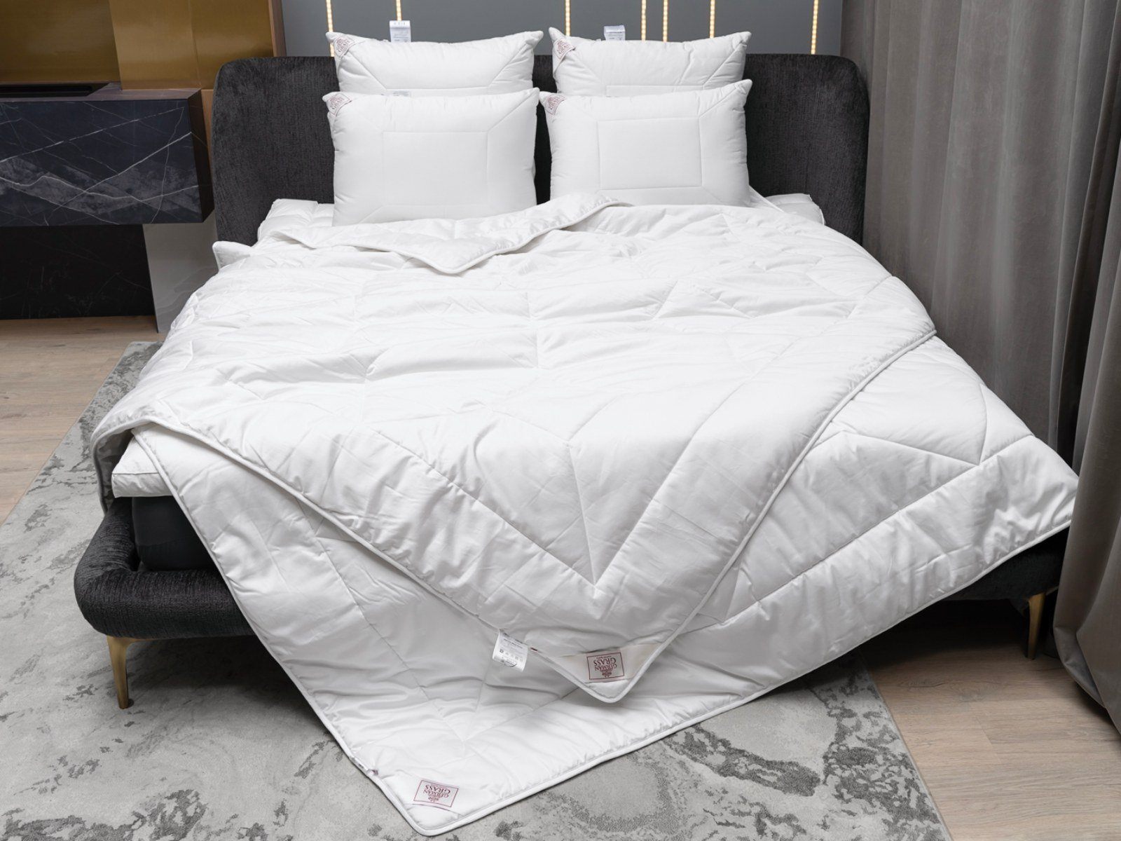Чехол: сатин пуходержащий (Fine sateen), 100% cotton (хлопок); наполнитель в чехле - шерсть мериноса (100% MERINO GRASS®), термоскрепленная высокосиликонизированным би-компонентом. Цвет - белый. Плетение нитей Nm 160/133 TC 350.