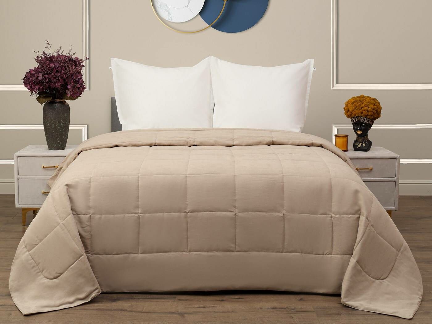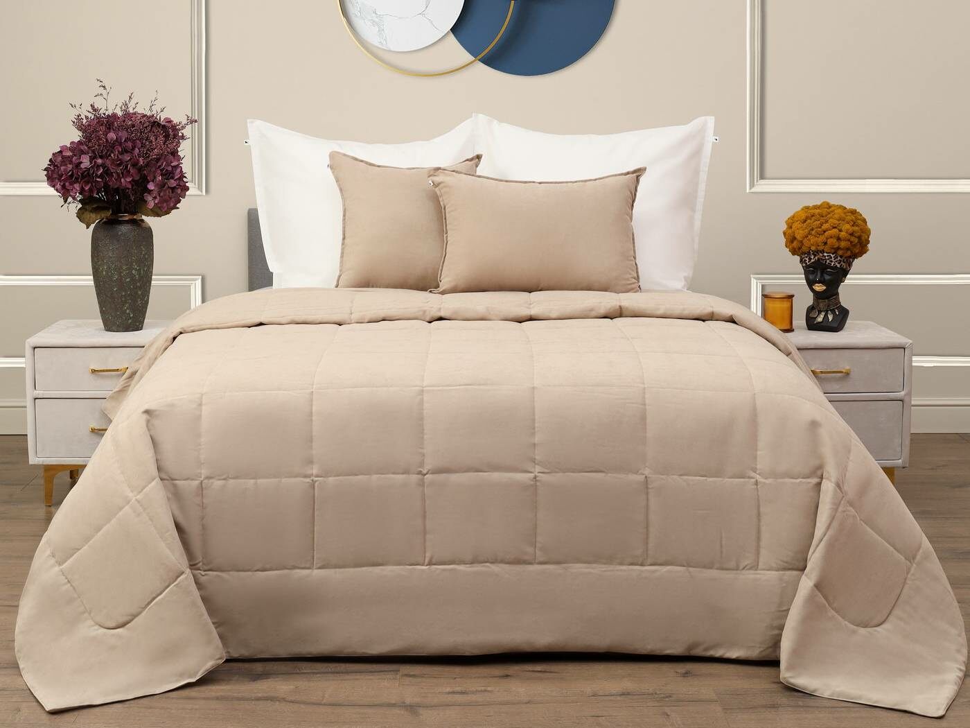 Ткань верха – бархатистый канвас. Канвас отлично себя зарекомендовал как износостойкий и плотный материал обеспечивающий мягкий противоскользящий эффект. Покрывала имеют классическую для канваса машинную стежку «квадрат». Плотная и мягкая фактура ткани канвас не оставляет зацепок, изнаночная сторона выполнена из матового и нежного тика. Такое покрывало украсит собою спальную или гостиную комнату, органично подчеркнет Ваш утонченный стиль.
